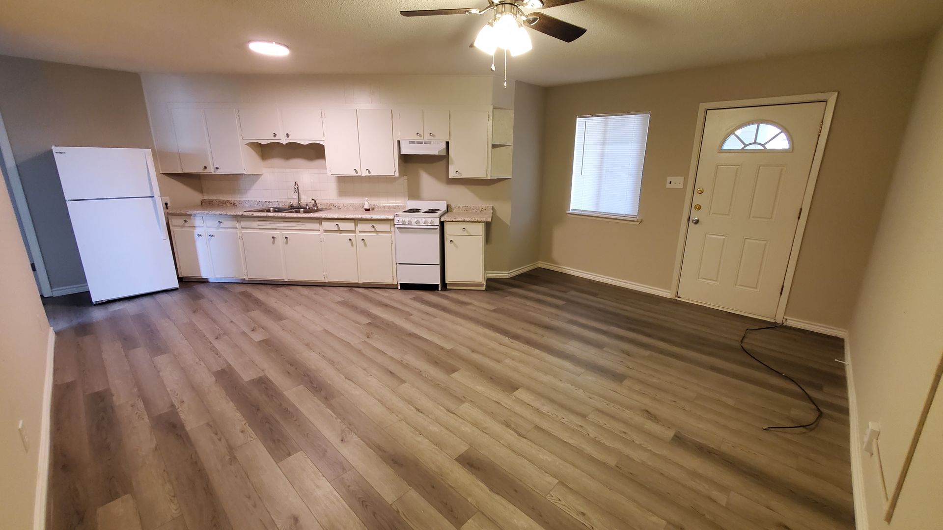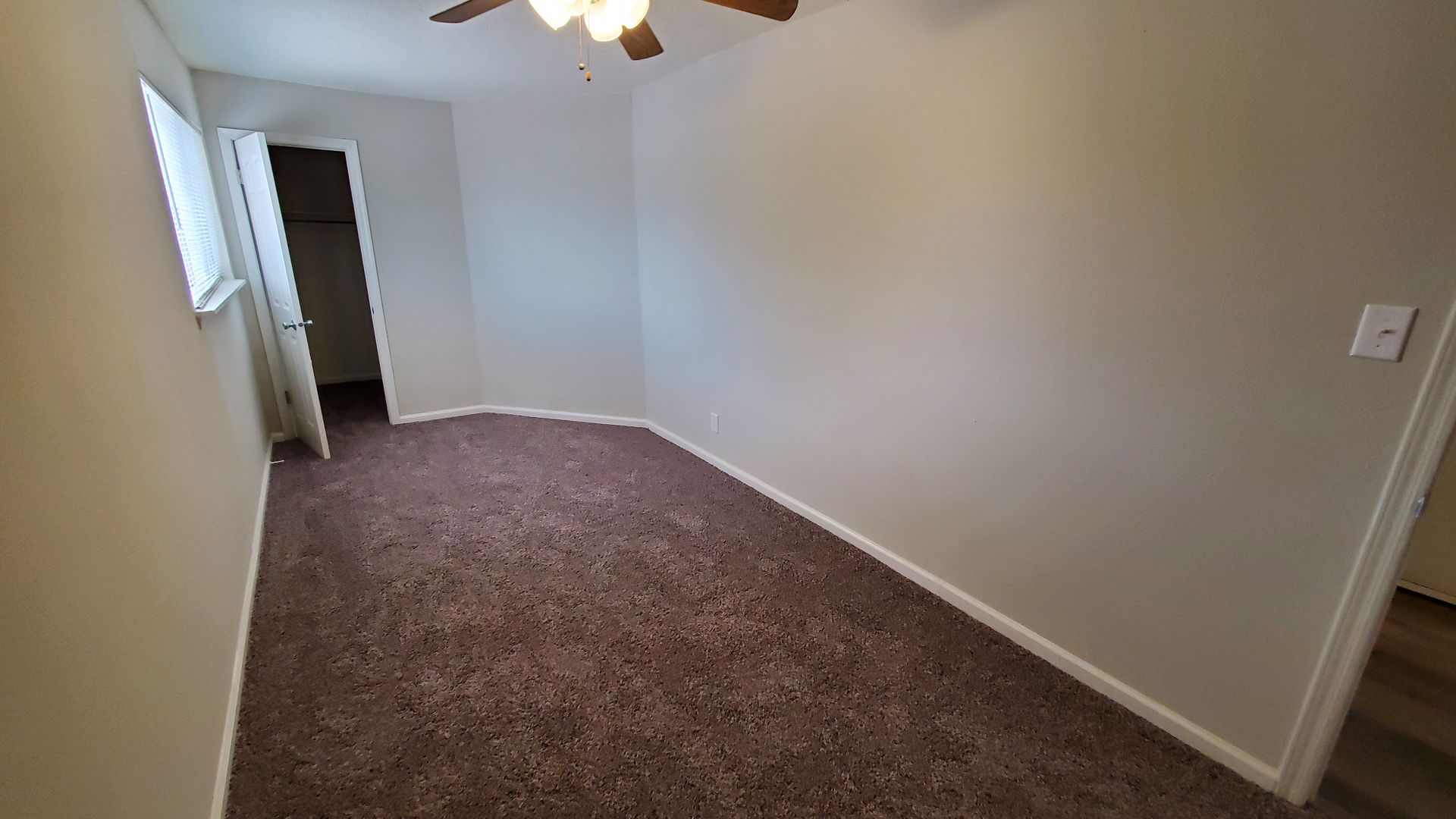 Two bedroom one bathroom. Kitchen has stove/oven and fridge. Ceiling fan in living room and bedrooms. Newer carpet in bedrooms. Laminate in living room, kitchen, and bathroom. Unit has been freshly painted and professionally cleaned. This apartment is on the second floor. There is a laundry facility on site. Off road parking provided.