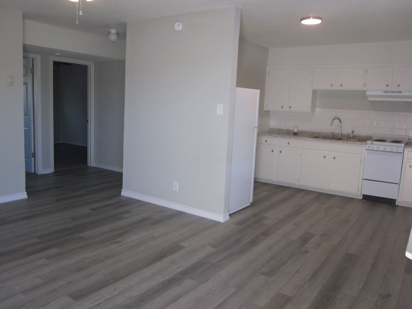 Two bedroom one bathroom apartment with 752 sq. ft. Kitchen has new stove/oven and fridge. Laminate flooring with carpet in the bedrooms. Ceiling fan in living room and bedrooms. Unit has been freshly painted and professionally cleaned. There is a laundry facility on site. Off road parking provided.